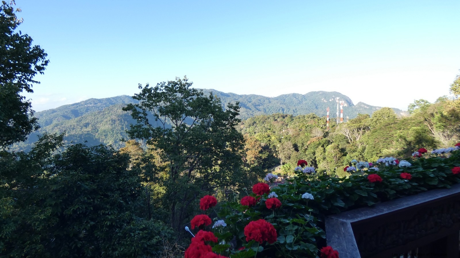 Le téléphérique est très bien construit et sécurisé, ouf .. . . . . . . Le dénivelé est très important. Le site là haut est magnifique, il est possible de marcher 11 kilomètres pour rejoindre un monastère, mais nous nous sommes contentés de marcher et grimper pendant 3 heures environ. La montagne est couverte de sapins et de rhododendrons immenses, dommage pour nous que la floraison ne fait que commencer.
